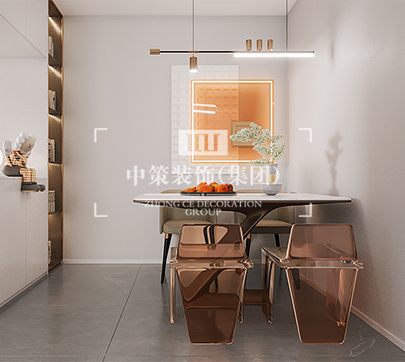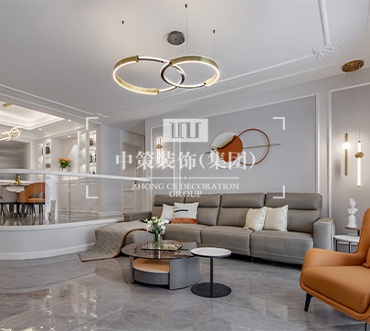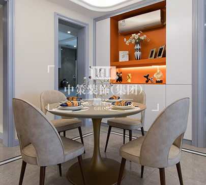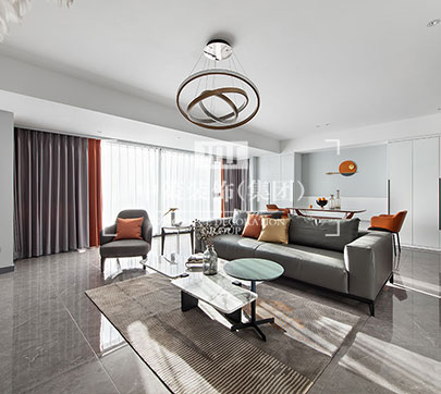 没有过于抢眼的造型,亦没有丰富色彩的叠加,而是以最典型的现代简约风格,令所有的色调统一,同时,细节处流露出精致的生活格调。 简洁、大方是映入眼帘的第一印象,现代的经典家具、美丽的织物和花束,使得客厅成为享用下午茶、休闲放松的完美场所。客厅空间的家具以金属、皮革的中性色调为主,造型简洁,线条流畅,用高纯度的橙色传递细腻的质感,搭配顶上的圆弧形不锈钢线条,使得整个空间灵动又舒适;造型简洁、线条流畅的家具组合搭配,营造出稳定、协调、温馨的空间感受,满足现代年轻家庭的轻奢需求。
